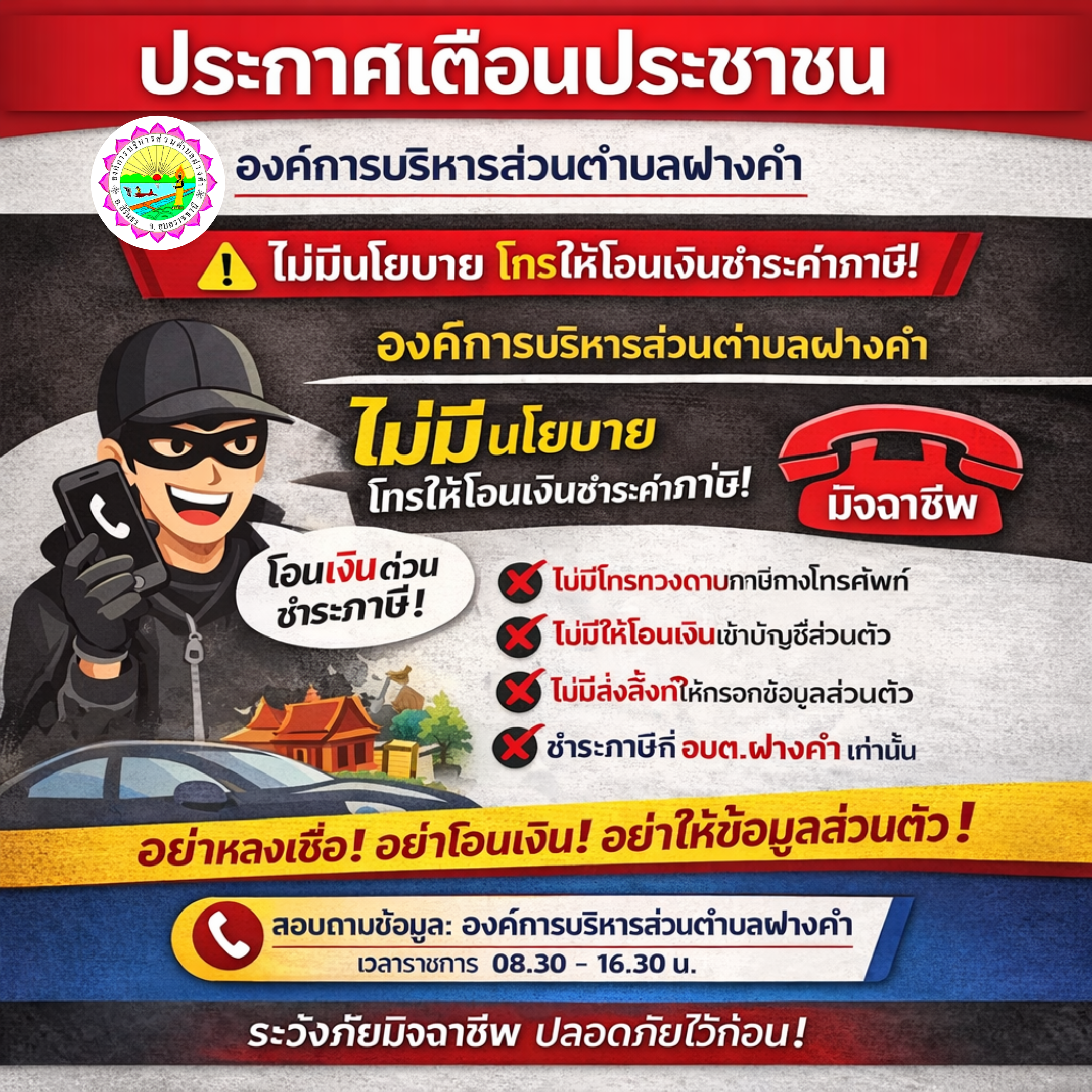⚠️ องค์การบริหารส่วนตำบลฝางคำ ไม่มีนโยบายโทรศัพท์ติดต่อให้ประชาชนโอนเงิน หรือชำระค่าภาษีผ่านทางโทรศัพท์ทุกกรณี ⚠️ [11 กุมภาพันธ์ 2569]